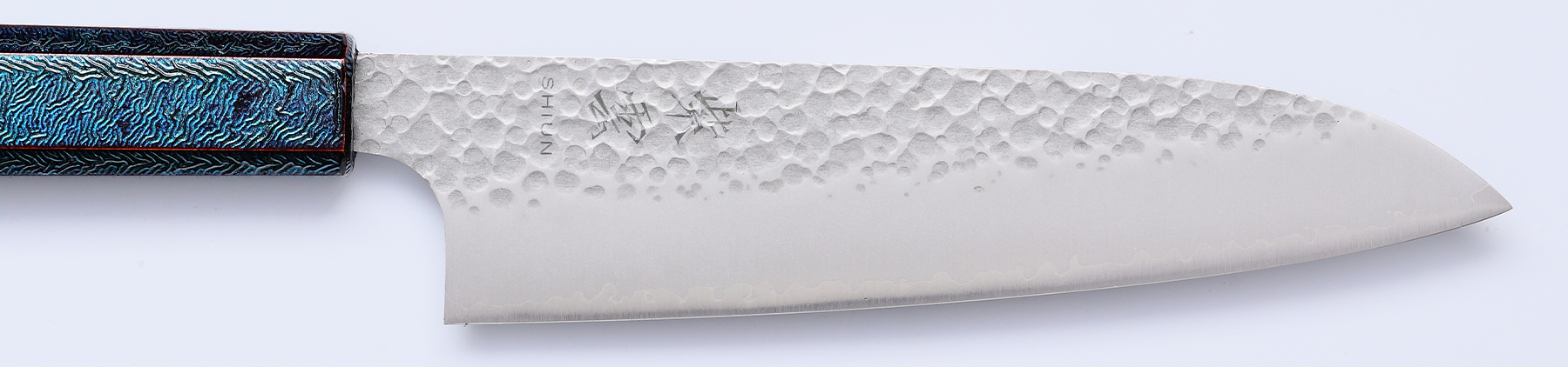 芯材のVG-10はコバルトを含有したハイ・カーボンステンレス鋼です。硬度60-61と硬く、切味・耐摩耗性に優れ、包丁には最適な材質です。両面合わせて3層のステンレスを重ね、槌目模様の鏡面仕上げとなっております。